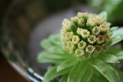 玄関先の水盤の中の「ふきのとう」が、いつのまにか全開になっていました。外は吹雪なのに頑張っている「ふきのとう」は春の使者様のごときです。