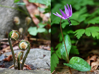 サクラマスばかり注目しているうちに、いづみや旅館の小さな庭も春を迎えていました。ゼンマイが芽を出し、カタクリの紫色の花弁も反り返ってます。
